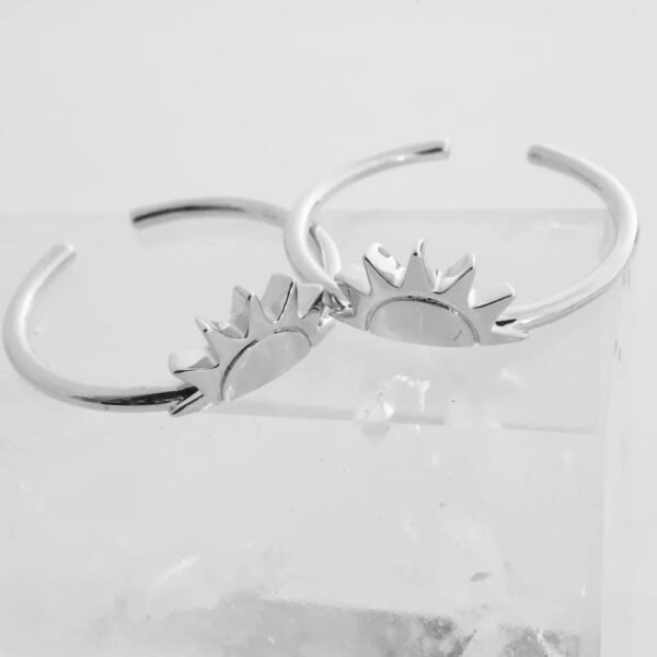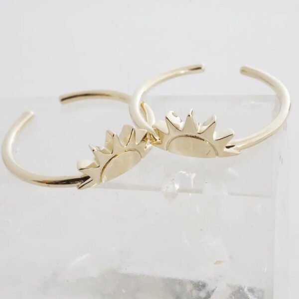 A set of two rings that fit together to form a radiant sun symbolizing warmth. connection. and light. Wear them stacked for a playful. bold look or split the set and gift the other half to someone who brightens your life. A meaningful piece. perfect for sharing or keeping all to yourself. Each ring is adjustable between sizes 5-8 for a comfortable. customizable fit. Half sun measures 10mm x 6mm; band is 1.5mm wide.