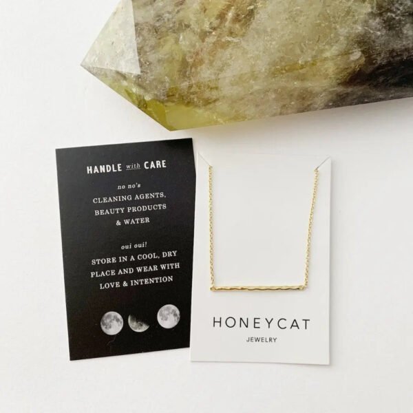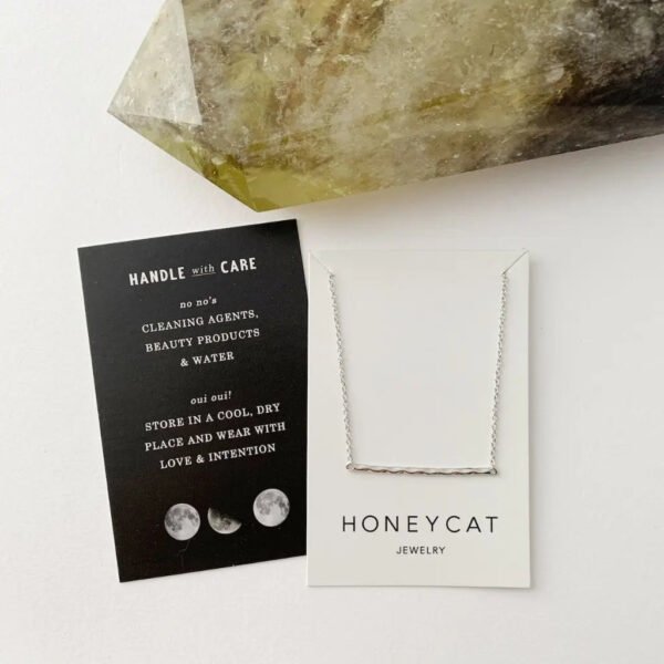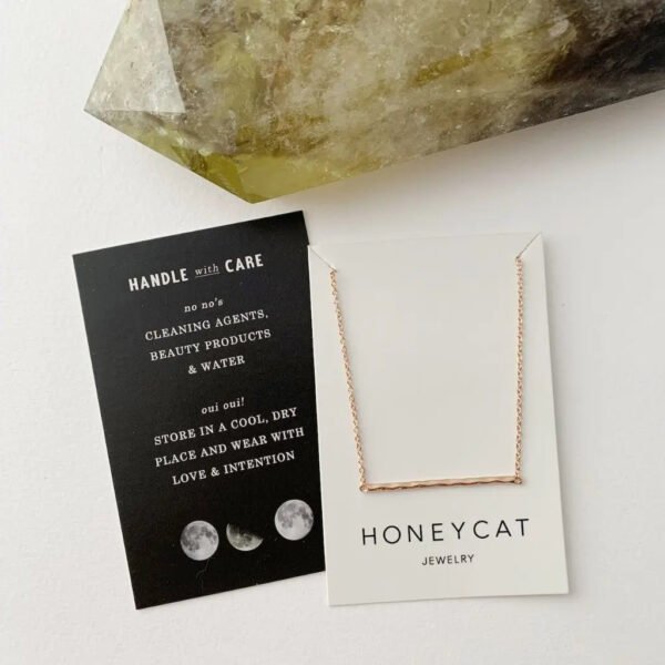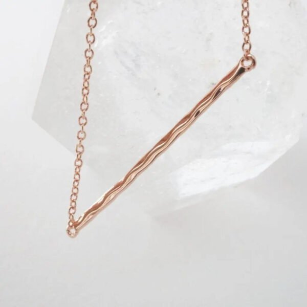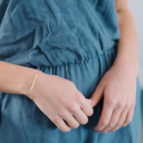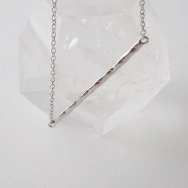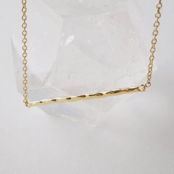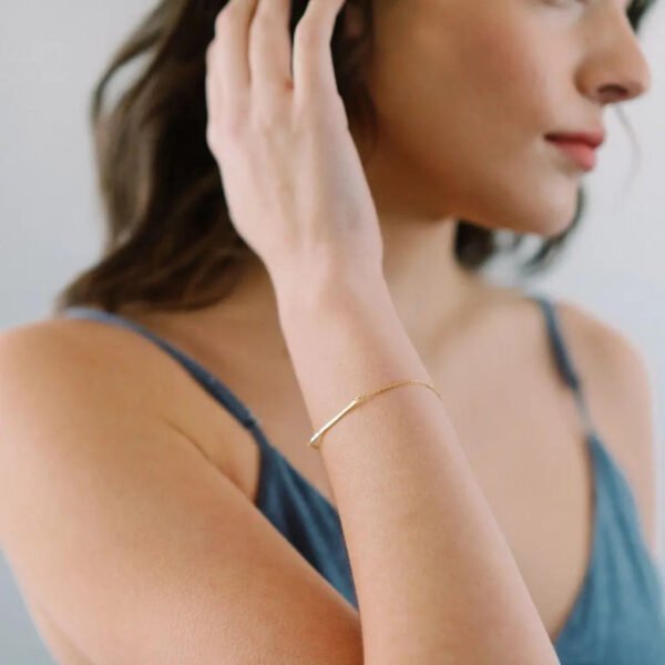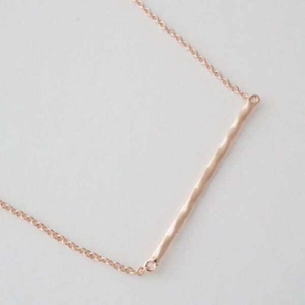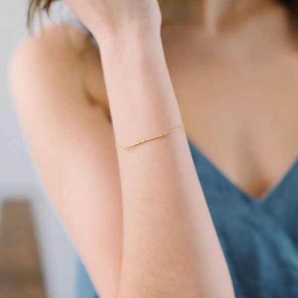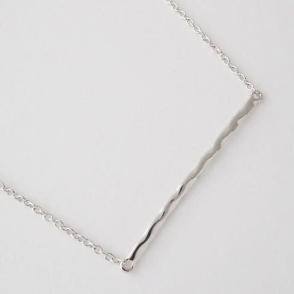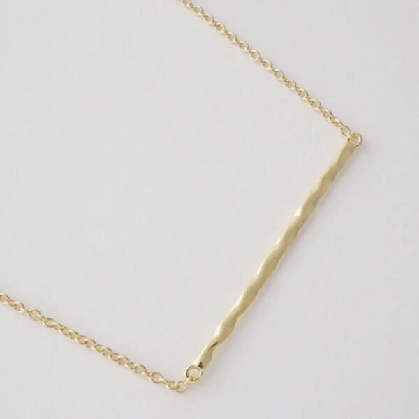 A skinny hammered. horizontal bar strung on a thin chain. A classic bracelet silhouette and jewelry box necessity.